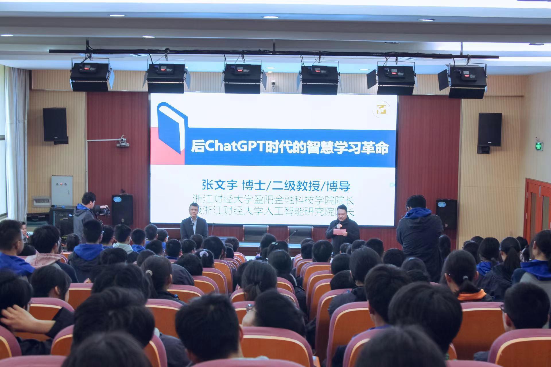 3月17日下午,公司经理张文宇教授应邀前往杭州第四中学吴山校区(浙江省一级重点中学)开展“教授博士进中学”活动,并结合当前热点,作“后ChatGPT时代的智慧学习革命”主题的科普讲座,受到杭州第四中学吴山校区师生的热烈欢迎。校区以科学馆阶梯教室为主会场,高一各班教室(实时直播)为分会场开展了“养正大讲堂”的开春第一课。
