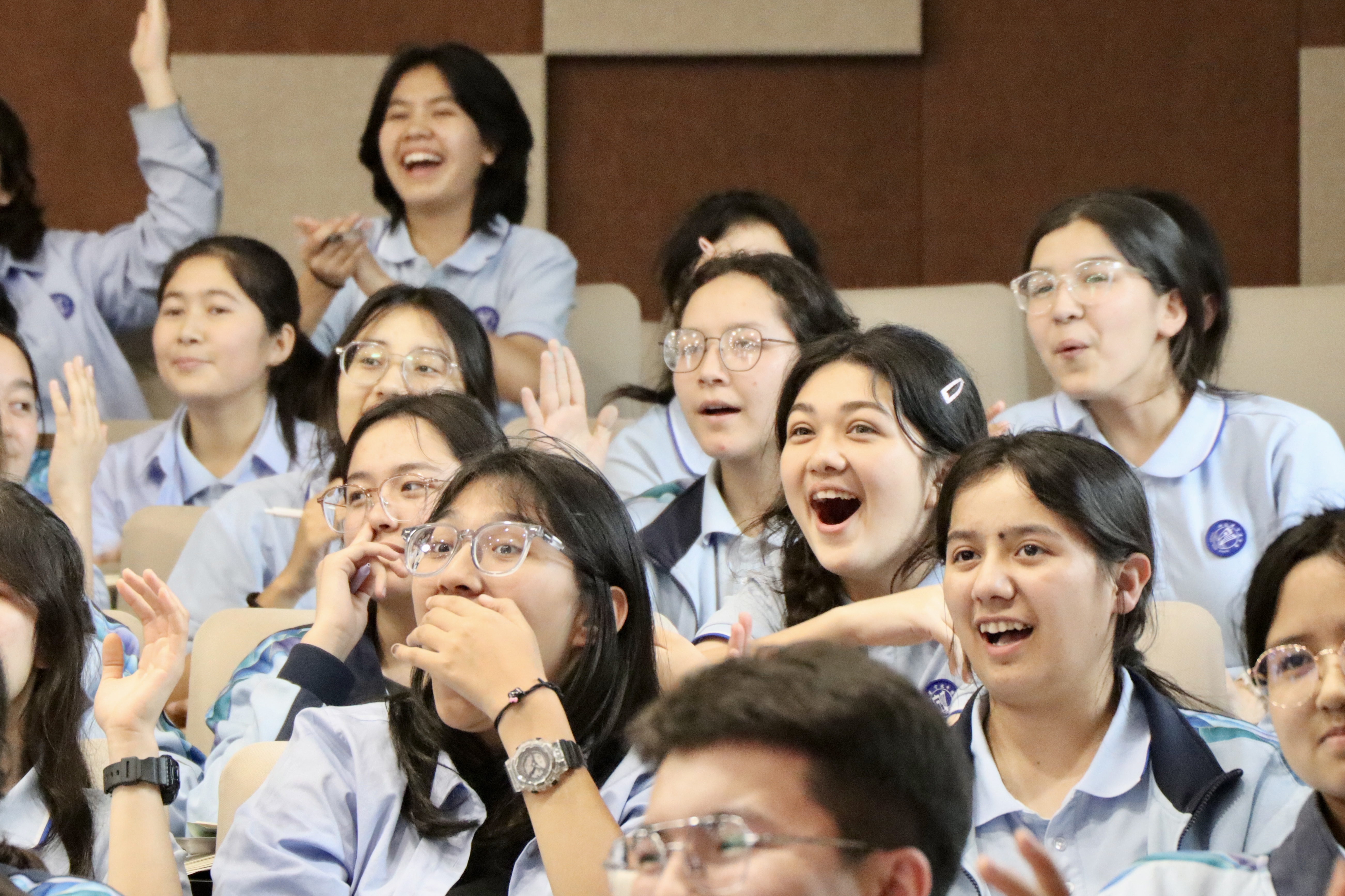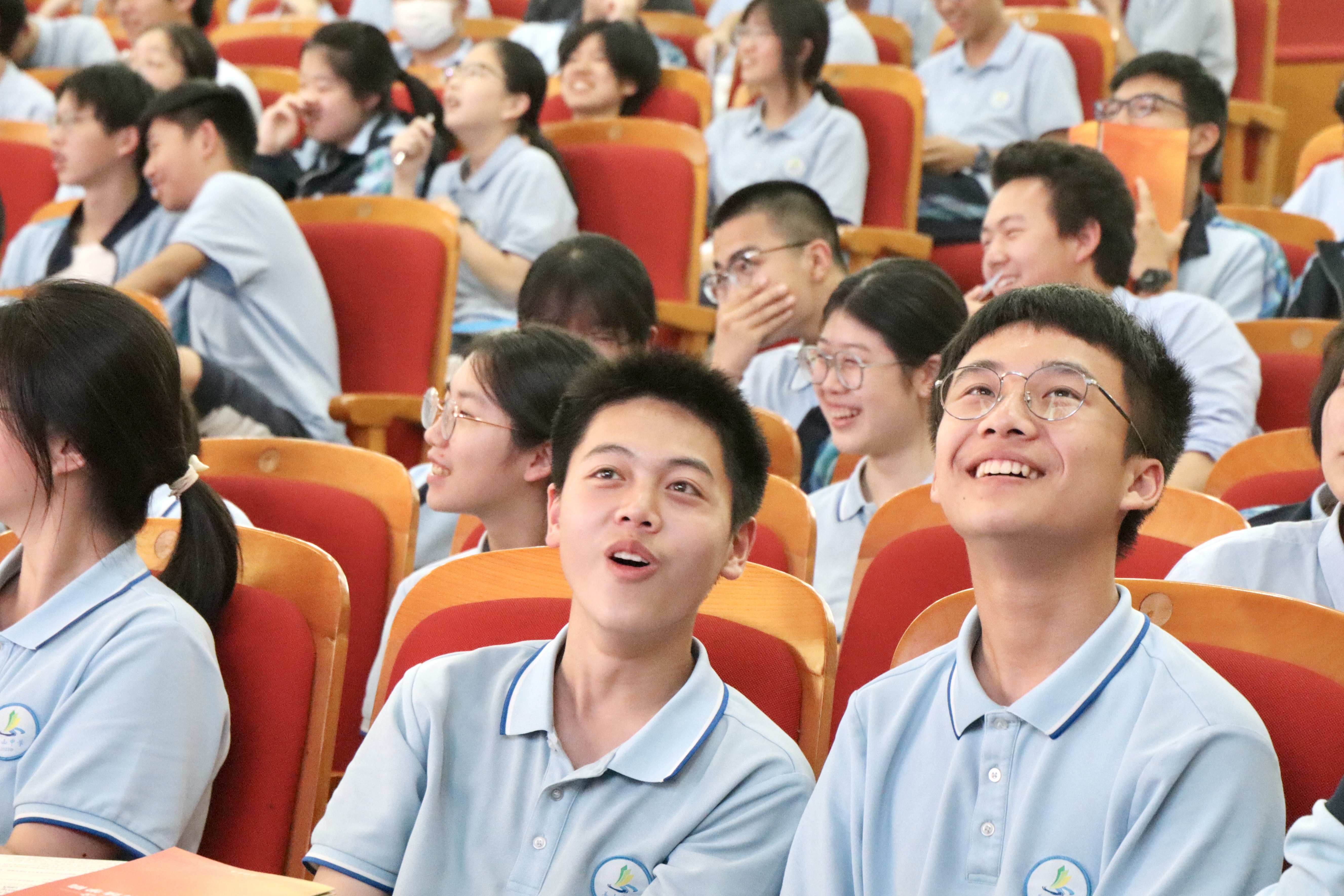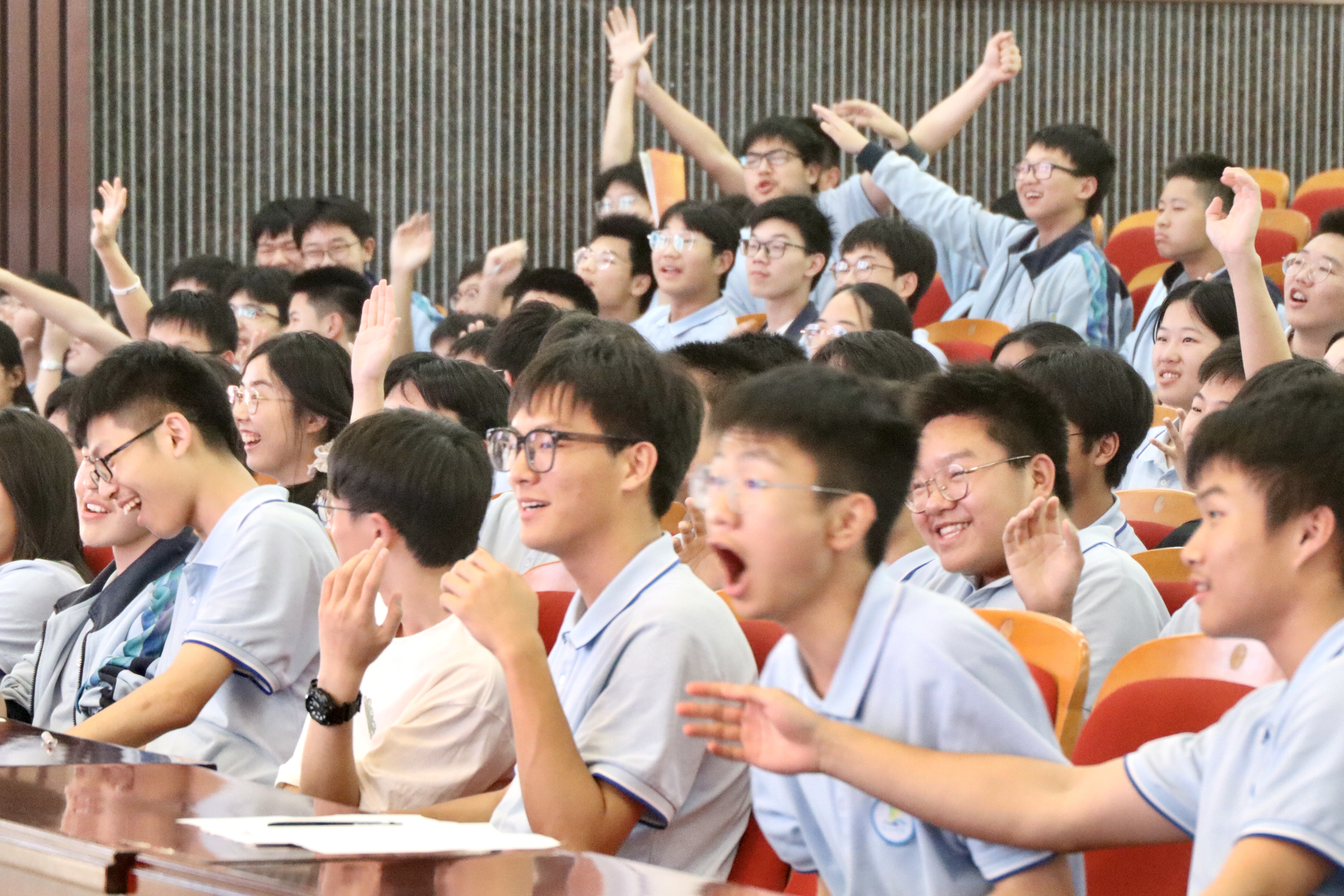 掌声未停,张文宇便询问同学们“这样的演讲词GPT写得出来吗?”接着,通过“ChatGPT横空出世”、“可以与狼共舞吗?”、“人机融合智能闪亮登场”“如何鹤立“机”群?”……张教授风趣幽默,金句频出,出口成章,以贴近00后的语言风格,讲述了通用人工智能这一高深话题。在现场一浪高过一浪的喝彩声和掌声中,张教授为同学们阐明了现实:人工智能已无处不在。同时引导大家思考:在人工智能技术飞速发展的时代,年轻人将如何为中华崛起而读书、为中华腾飞而双减?并如何把减下来的时间用于做科学教育与智慧学习的加法?