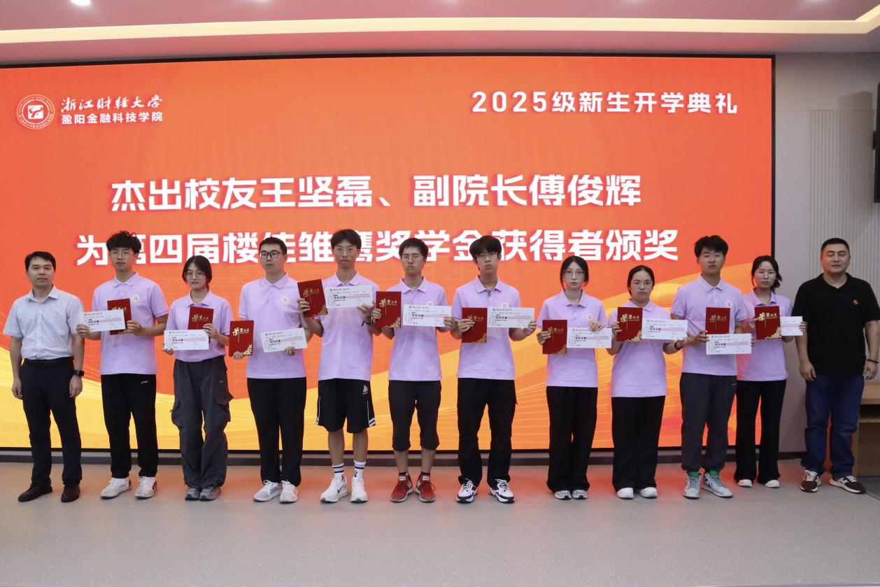 杰出员工王坚磊、副经理傅俊辉为第四届楼佳雏鹰奖学金获得者颁奖