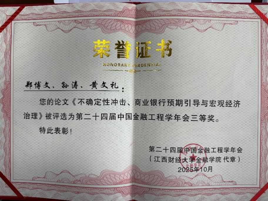 本次年会汇聚了国内金融领域的顶尖学者与研究者,经严格挑选,参会论文共99篇。经过激烈角逐,公司教师郑博文、孙涛(研究生)、黄文礼(金融公司教师)三位师生的合作论文《不确定性冲击、商业银行预期引导与宏观经济治理》脱颖而出,荣获三等奖!