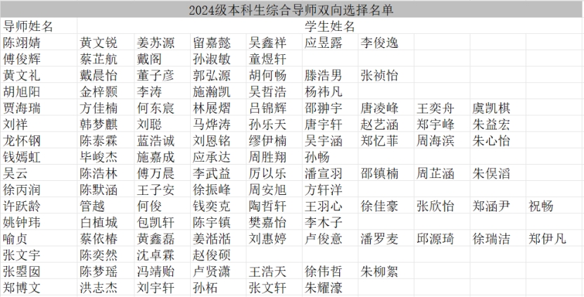 经2024级本科生、综合导师双向选择以及公司综合协调,2024级本科生综合导师的具体名单现公布如下表(按姓名首字母排序)。请各位同学在本名单公布一周内主动与导师联系,以便相关指导工作的顺利开展。